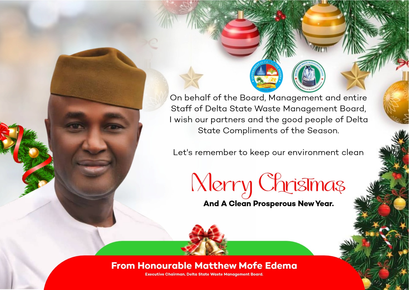 The Executive Chairman of the Delta State Waste Management Board (DSWMB), Hon. Matthew Mofe Edema, has extended warm Christmas and New Year goodwill messages to partners, stakeholders and the people of Delta State, calling for renewed commitment to environmental cleanliness and sustainability.